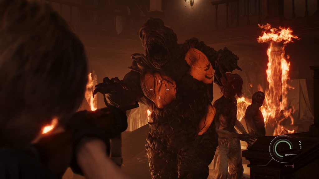 Un autre rythme de jeu dont les fans de la licence sont coutumiers est celui du pur jeu de tir à la troisième personne. Leon, agent secret surentraîné, protagoniste clé de la licence depuis 1998, renverse les codes du gameplay de Grace. Si les deux protagonistes se contrôlent de manière identique, avec les mêmes boutons, les mêmes déplacements, les mêmes systèmes de visée, de tir, etc, le feeling ne pourrait pas être plus distinct. Leon est une équipe de démolition à lui tout seul, un bulldozer inarrêtable qui renverse tout sur son passage. Le joueur n’est pas rendu invincible (en réalité il est presque aussi vulnérable qu’avec Grace) mais il dispose d’un tel arsenal, et de tellement d’options de combat au corps à corps ultra létales que des pièces entières remplies de monstres deviennent un terrain de jeu.