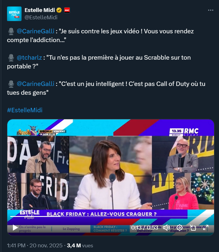 Derrière cet échange entre Carine Galli et les autres personnes en plateau assez raisonnables, plusieurs poncifs tournent autour du jeu vidéo. Le plus difficile étant celui à faire raisonner aux gens que s’ils jouent à Candy Crush ou au Scrabble sur leur téléphone, ils jouent eux aussi aux jeux vidéos. Car lorsque l’on parle des 40 millions de joueurs et joueuses évoqués par Charles Magnien, l’on fait référence aux chiffres avancés par le SELL, à savoir le syndicat des éditeurs de logiciels de loisirs. Un chiffre qui comprend aussi bien les passionnés de jeu vidéo que les joueurs occasionnels, voire très occasionnels. La donne a changé.
