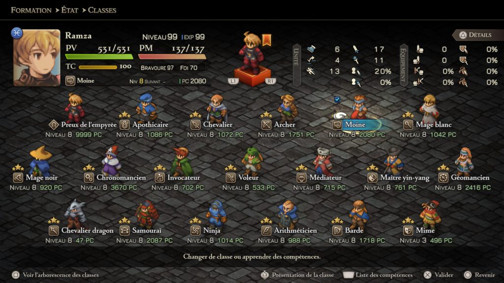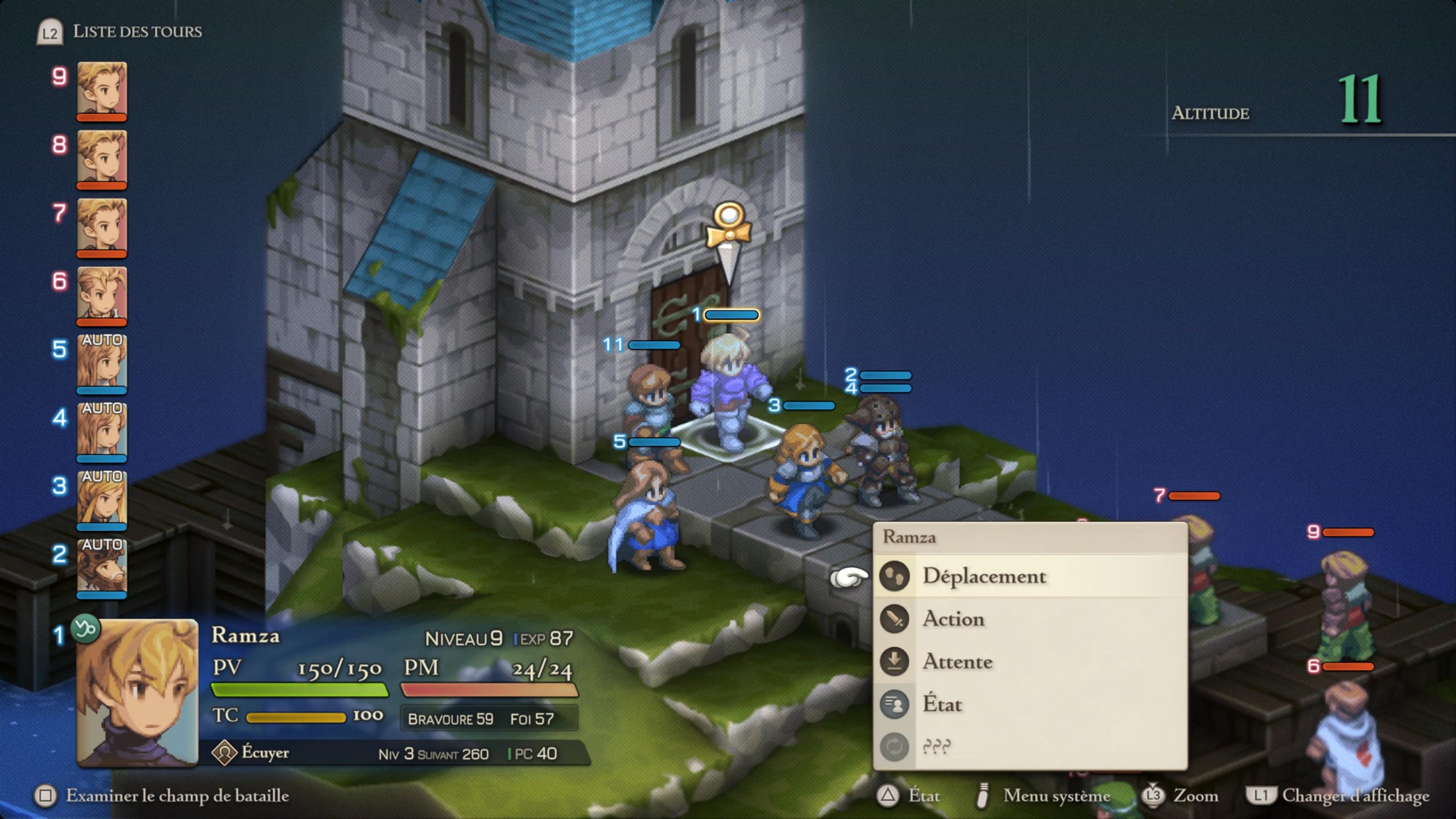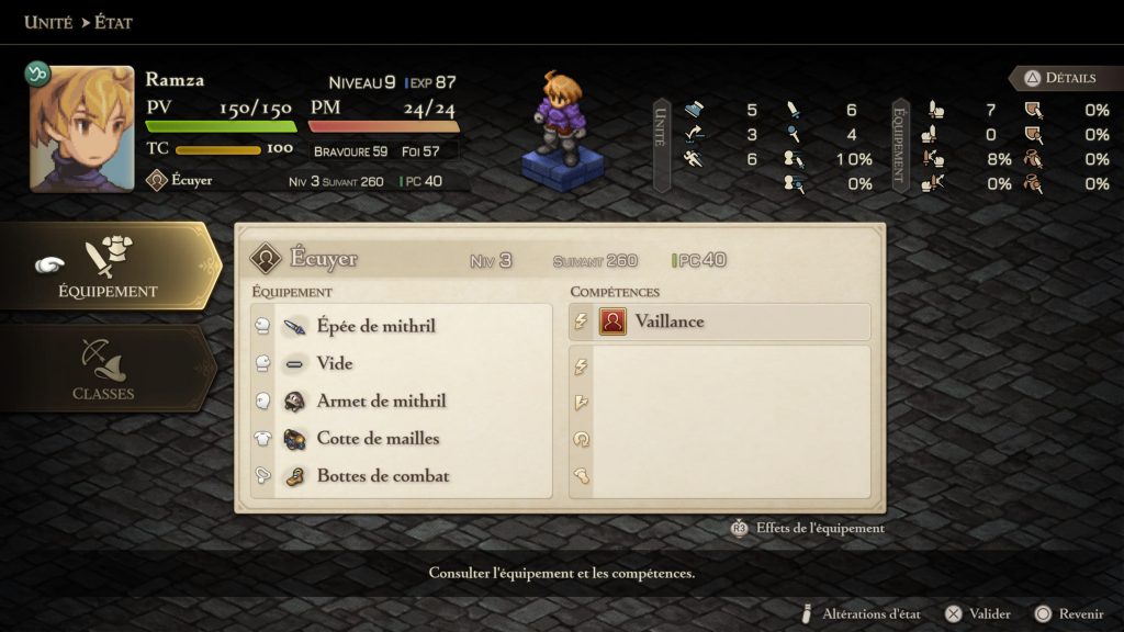 Certaines classes ont été rééquilibrées, surtout les unités secondaires ou plus obscures, longtemps considérées comme trop faibles ou inutiles. Par exemple, le chromancien (mage temporel) dans l’original, certaines magies comme hate ou lenteur étaient extrêmement utiles, mais la progression vers les sorts avancés demandait un farm excessif. Dans ce remaster, la courbe d’apprentissage a été adoucie afin de réduire le farm même si quelques sessions de progression restent nécessaires. Les compétences sont mieux décrites, ce qui permet de planifier ses stratégies avec plus de précision. Avant de déclencher une action sur un ennemi, vous pouvez apercevoir le montant des dégâts (si votre coup réussi bien évidemment) hors coup critique. Malgré ces ajustements, l’âme du gameplay reste intacte, chaque affrontement continue de récompenser la réflexion et la stratégie. Et les choix faits hors combat (distribution des équipements, progression des classes,…) ont toujours un impact direct sur le déroulement des batailles.