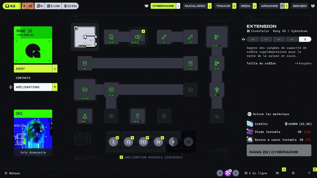 Réaliser les quêtes de Faction ne s’arrête pas à seulement débloquer des récompenses puisque chaque Faction dispose de son propre arbre de compétences, qui se débloquent en échange de Crédits et de certains matériaux. Plus vous augmentez de niveau avec une Faction et plus vous avez la possibilité de débloquer des compétences. Certaines compétences de Factions vont vous permettre d’améliorer la mobilité de votre Runner, tandis que d’autres vont vous donner l’accès à de plus en plus d’équipements puissants à acheter directement au troc.
