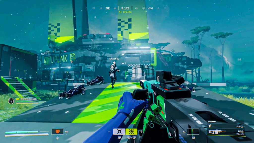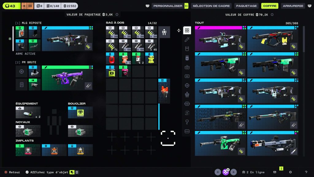 La profondeur du gameplay ne s’arrête pas à la sélection de votre Runner puisque la personnalisation va encore plus loin. Avant de vous déployer en partie, vous pouvez équiper jusqu’à 2 armes, un type de grenade, un bouclier, 2 noyaux et 3 implants et ces composantes font partie du « Buildcrafting » de votre Runner. Les Noyaux et les Implants contribuent à la profondeur du gameplay puisqu’il en existe une pléthore à looter dans le jeu, vous permettant de modifier les capacités de votre Runner et d’obtenir des bonus passifs. Le jeu intègre aussi une barre de Chaleur, qui remplace la barre d’endurance traditionnelle : courir, glisser, sauter, subir des dégâts environnementaux ou utiliser certaines compétences consomment de la Chaleur et une mauvaise gestion peut entraîner une Surchauffe, à tel point votre vision se brouille, vous ne pouvez plus utiliser de capacités, et vous subissez des dégâts continus sur votre armure jusqu’à ce que la chaleur retombe. Pour mieux gérer cela et comme de nombreuses capacités dans le jeu, vous pouvez débloquer des améliorations afin que la barre de Chaleur se remplisse beaucoup moins rapidement, tandis que des consommables peuvent aussi être utilisés pour améliorer l’endurance de votre Runner.