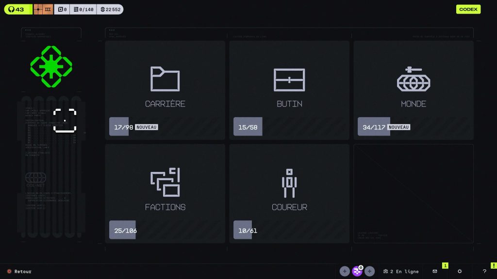Mais la véritable âme du jeu réside dans le Codex. Contrairement à votre équipement, le Codex est permanent et ne subit jamais de reset, même lors des changements de saison (hormis les déblocages de réduction de prix dans le troc, les schémas d’armes, les clés à utiliser sur les cartes etc..). Vous avez une pléthore de défis à réaliser qui vous permet de récupérer des récompenses cosmétiques ou utiles pour le combat, mais aussi de débloquer de nouveaux documents en lien avec le lore du jeu. C’est une progression méta-narrative brillante qui transforme chaque « run », même ratée sur le plan du loot, en une avancée dans la compréhension de l’univers. Marathon ne vous demande pas seulement de devenir plus puissant, il vous demande aussi de percer ses secrets.