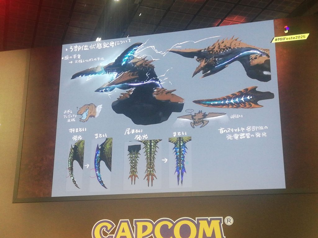 Comme dit précédemment, la démo de Monster Hunter Stories 3 n’était pas la seule attraction à être présentée lors de cette dernière Paris Games Week. Outre la compétition E-Sport Monster Hunter Wilds France Championship remportée par l’équipe Hunter’s Pride, le producteur de la série Ryozo Tsujimoto et le directeur du jeu étaient présents pour quelques dédicaces et explications. La plus intéressante était sans aucun doute la masterclass menée par Tokuda autour du Rey Dau, l’un des monstres emblématiques de Monster Hunter Wilds. Concept Art à l’appui, Tokuda a dévoilé les coulisses de la création de ce monstre, de son écologie à ses attaques, en passant par le choix de son design et son nom. Une conférence qui permet de prendre toute la mesure du soin extraordinaire mis dans chacun des monstres de la série, point que nous avions déjà relevé lors du test en mars dernier. Une cinquantaine d’autres concepts arts étaient visibles dans une petite exposition annexe qui permettait d’apprécier tout le travail réalisé sur Wilds. Outre les monstres, les visiteurs pouvaient y découvrir d’autres croquis de lieux, personnages, armes et armures, et imaginer ou presque comment tout ces éléments avaient pu être conçus.