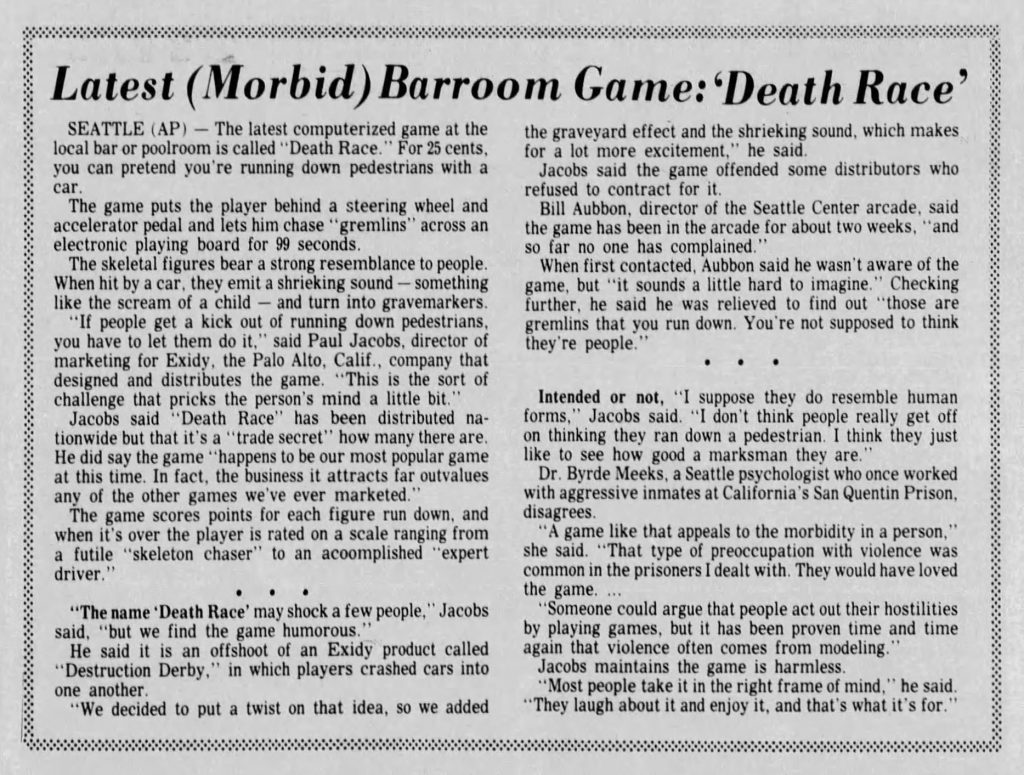 Si la sortie du jeu en avril 1976 ne fait aucune vague, le vent va commencer à se lever trois mois plus tard quand la journaliste Wendy Walker va écrire un article inquiet sur le titre le 3 juillet 1976 pour le Ithaca Journal, qui va faire l’effet d’une poudrière. Selon elle, les personnages que les joueurs et les joueuses écrasent ressemblent à des piétons . À partir de là, divers organes de presse, locaux principalement, vont alors s’emparer de cette dépêche tout en la tronquant (parce que sinon, on ne vend pas). Mais la bombe va réellement exploser en décembre 1976 quand le National Safety Council va lui aussi publier un article, déclenchant une seconde vague d’indignation. Et eux ne vont pas y aller avec le dos de la cuillère en faisant en préambule le bilan des accidentés de la route avant de déchainer leur foudres avec notamment un fameux « Death Race n’est pas un jeu vidéo ! » Ambiance. L’histoire sera reprise cette fois-ci par les médias et antennes nationales, en utilisant d’ors et déjà les poncifs suranné d’une bonne vieille attaque envers le jeu vidéo. Musique inquiétante, témoignages accablants, invitation d’experts plus ou moins acquis à la cause de ce qu’on leur demande de critiquer. Et même déformation du sujet en évoquant par exemple des « cris d’enfants » quand on roule sur les passants. Des pétitions sont signées, des personnalités politiques s’emparent de l’affaire, et même des développeurs de l’époque comme Nolan Buschnell, l’un des co- fondateurs d’Atari, se font les critiques de ce jeu violent.